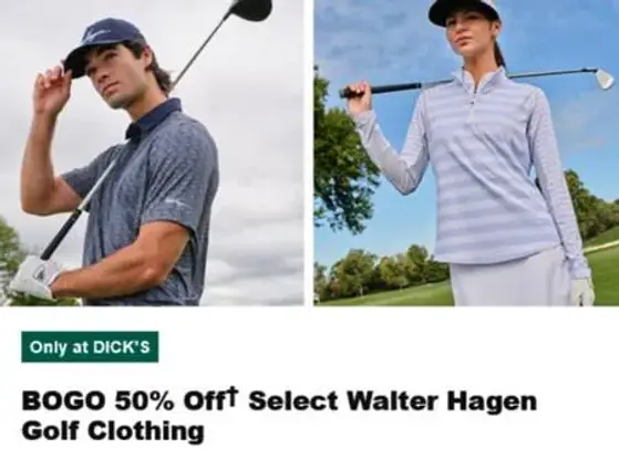 Don't miss out! Shop in store and enjoy BOGO 50% off† select Walter Hagen golf clothing.